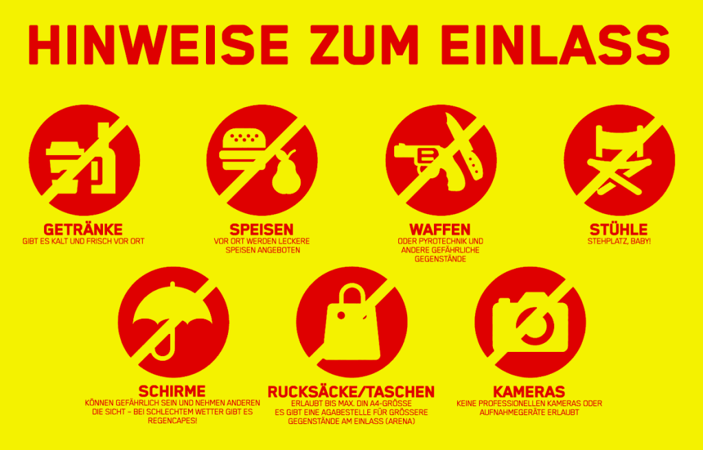 Mitgebrachte Speisen und Getränke (in (PET-)Flaschen oder Dosen) sind leider nicht erlaubt. Ihr könnt aber natürlich alles vor Ort kaufen: Kalt oder heiß, frisch und lecker! Professionelle Kameras oder Aufnahmegeräte sind ebenso nicht erlaubt wie Actioncams, Laserpointer oder gar Pyrotechnik. Wie immer sind auch Sprays jeder Art, Regenschirme (auch „Knirpse“), Stühle, auch Hocker und Faltsessel, Erhöhungen zum Stehen sowie Nieten (größer als 1,5 cm), scharfe/spitze Gegenstände, Waffen, Tiere und Nazis nicht erlaubt.