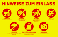Mitgebrachte Getränke und Speisen sind leider nicht erlaubt. Ihr könnt aber natürlich alles vor Ort kaufen: Kalt oder heiß, frisch und lecker! Professionelle Kameras oder Aufnahmegeräte sind ebenso nicht erlaubt wie Actioncams, Laserpointer oder gar Pyrotechnik. Wie immer sind auch Sprays jeder Art, Regenschirme (auch „Knirpse“), Stühle, auch Hocker und Faltsessel, Erhöhungen zum Stehen sowie Nieten (größer als 1,5 cm), scharfe/spitze Gegenstände, Waffen, Tiere und Nazis nicht erlaubt.
